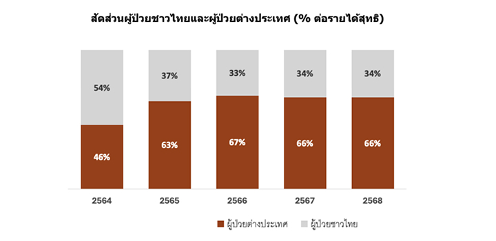 รูปภาพต่อไปนี้ แสดงถึงรายได้จากกิจการโรงพยาบาลของบริษัทแบ่งตามผู้ป่วยชาวไทยและผู้ป่วยต่างประเทศในห้าปีที่ผ่านมา