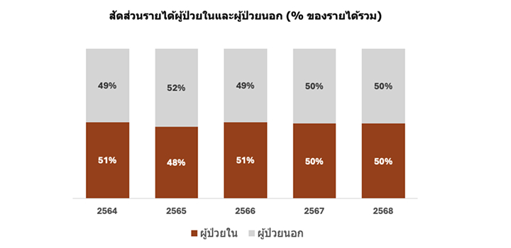 บริการผู้ป่วยใน มีจำนวนเตียงจดทะเบียน 580 เตียง ซึ่งรวมเตียงผู้ป่วยหนักทั่วไป และเตียงผู้ป่วยวิกฤตในปี 2568 บริษัทได้ให้บริการรักษาผู้ป่วยทั้งสิ้นมากกว่า 1.1 ล้านครั้ง โดยที่มีส่วนแบ่งรายได้จากผู้ป่วยในและผู้ป่วยนอกในปี 2568 ดังต่อไปนี้