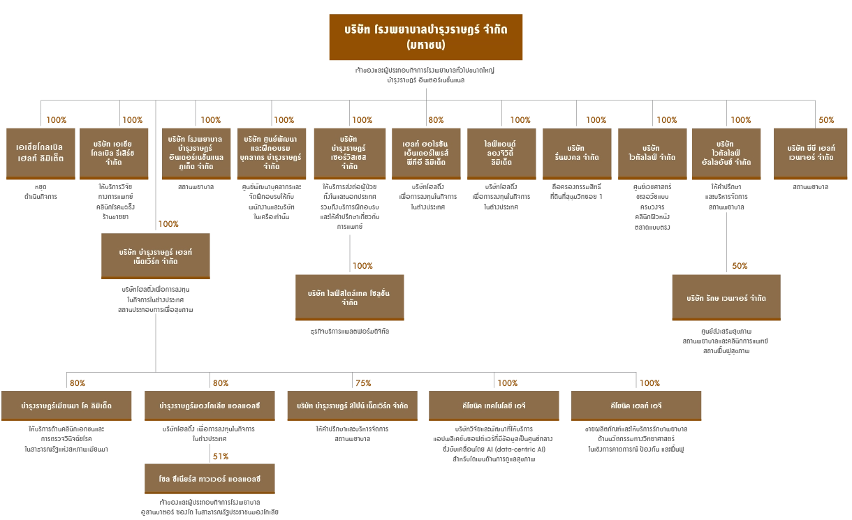 บริษัทมีบริษัทย่อยที่ถือหุ้นโดยตรง 11 บริษัท ประกอบด้วย (1) เอเชีย โกลเบิล เฮลธ์ ลิมิเต็ด (2) บริษัท เอเชีย โกลเบิล รีเสิร์ช จำกัด (3) บริษัท บำรุงราษฎร์ เฮลท์ เน็ตเวิร์ก จำกัด (เดิมชื่อ บริษัท ศูนย์พัฒนาบุคลากร บำรุงราษฎร์ จำกัด) (4) บริษัท โรงพยาบาลบำรุงราษฎร์อินเตอร์เนชั่นแนลภูเก็ต จำกัด (5) บริษัท ศูนย์พัฒนาและฝึกอบรมบุคลากร บำรุงราษฎร์ จำกัด (6) บริษัท บำรุงราษฎร์ เซอร์วิสเซส จำกัด (7) เฮลท์ ฮอไรซัน เอ็นเตอร์ไพรส์ พีทีอี ลิมิเต็ด (8) ไลฟ์ แอนด์ ลองจิวิตี้ ลิมิเต็ด (9) บริษัท รื่นมงคล จำกัด (10) บริษัท ไวทัลไลฟ์ จำกัด และ (11) บริษัท ไวทัลไลฟ์ อัลไลอันซ์ จำกัด